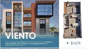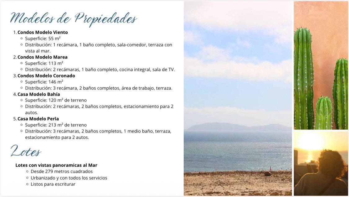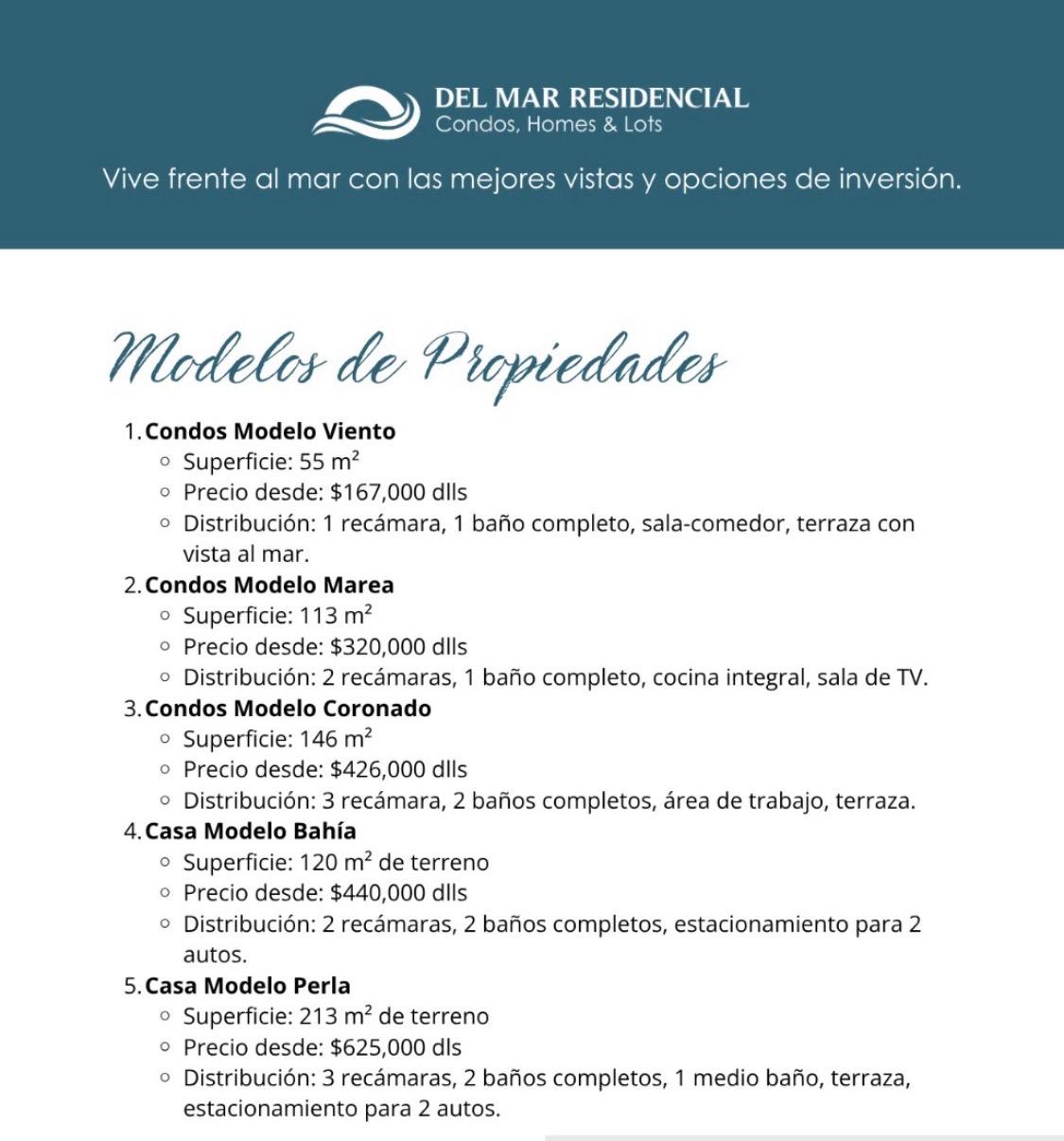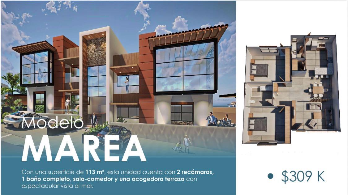 - Distribución: 1 recámara, 1 baño completo, sala-comedor, terraza con vista al mar. 2. Condos Modelo Marea